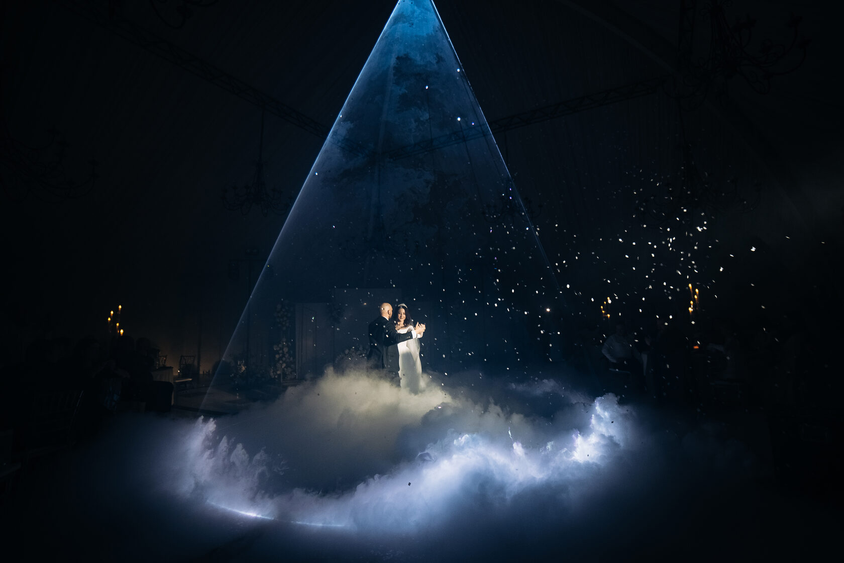Под любимую музыку, в облаках и мягких лучах света, пара будто парит над землёй. Волшебное сияние и мерцание огней создают ощущение, что время остановилось, и гости становятся свидетелями настоящего чуда. Это именно тот момент, который потом пересматривают на видео десятки раз — с улыбкой и мурашками.
